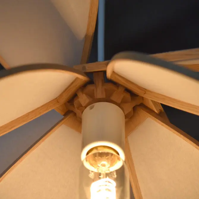 羽のようなシェードは、細い曲げ木に和紙を貼ってあります。 羽の向きを付け変えることで、全く違った2つのデザインを楽しむことができま す。細いフレームと和紙により、軽やかな印象に仕上がりました。