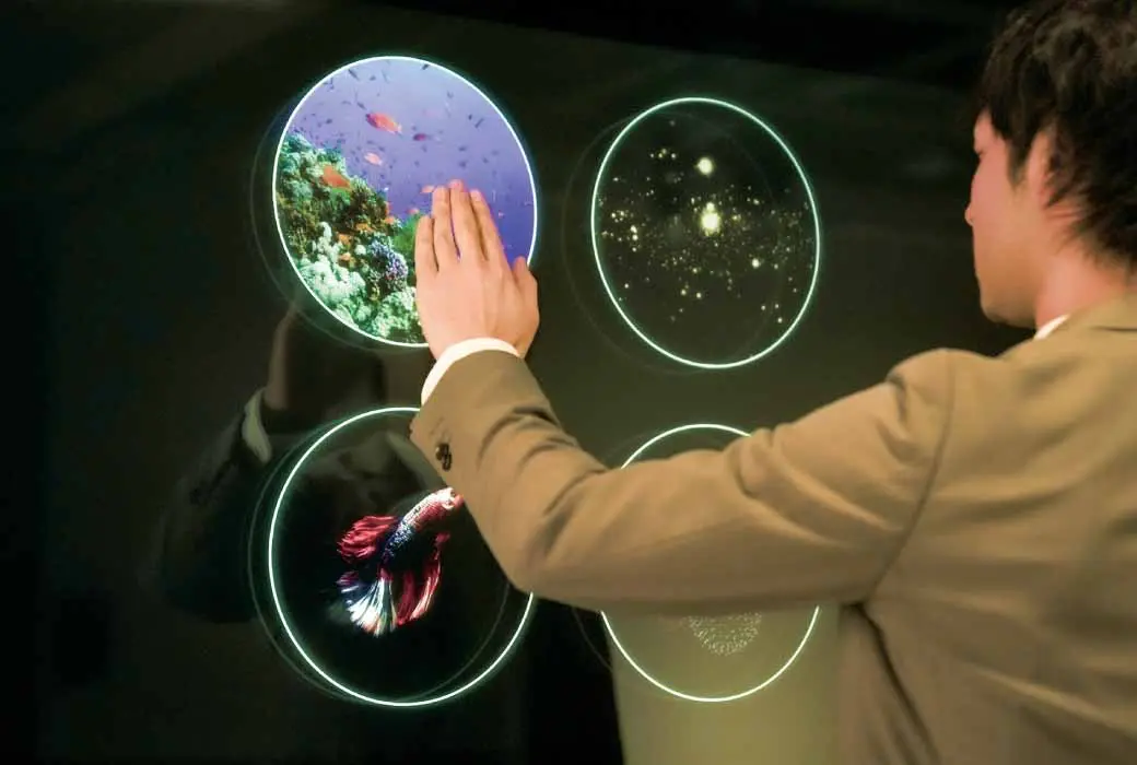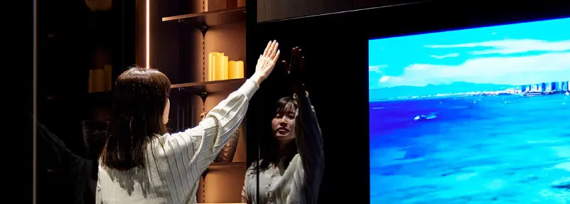 映像と文字のみが浮かび上がり、情報を美しく映し出します。多様なコンテンツと連携させることで、店舗やショールームなどの案内も効果的かつ躍動的なアプローチとなり、ゲストに、より付加価値の高いサービスを提供できます。