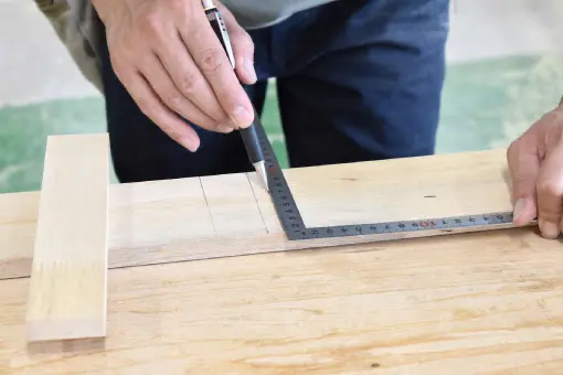 どのようにカットするかを決定し、切断や加工の基準となる線やポイントを墨出しします。墨出しは、家具の各パーツが正確にフィットし、設計図通りに仕上がるための非常に重要な工程です。